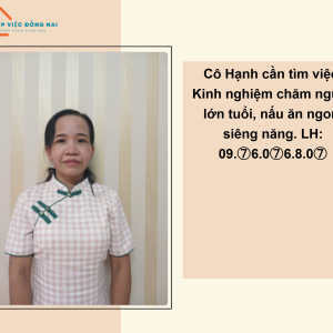 Quê: Trà Vinh *Công việc mong muốn: GIÚP VIỆC NHÀ – CHĂM ÔNG BÀ – CHĂM BỆNH *Gia đình: độc thân, không vướng bận gia đình *Kinh nghiệm: + chăm bệnh được hơn 14 năm + Gần đây, chăm bà bị tiểu đường nằm 1 chỗ ở Phú Quốc được gần 4 năm ( bà mất nên chị mới nghỉ ) *Ưu điểm: + Chị nấu ăn cơ bản gia đình, thay đổi theo khẩu vị gia đình + Chị siêng năng, chịu khó, không ngại việc, tiếp thu, hoà hợp, vui vẻ như trong gia đình chị làm ở đâu mọi người cũng quý mến chị về công việc cũng như tính cách chị. + Chị tiếp thu nhanh, thiết bị hiện đại chị đều sử dụng, sạch sẽ + Sức khoẻ chị rất tốt, nhà 2, 3 lầu hay biệt thự không thành vấn đề. + Chị có kinh nghiệm chăm sóc người lớn tuổi, người bệnh. Bà đau ốm nằm 1 chỗ cô chăm sóc chu đáo, lo thuốc thang đúng giờ, cho ăn bằng ống. Ngủ đêm với ông bà được. + Chị chăm được tất cả các ca bệnh nặng của người bệnh, có thể hút đàm, cho ăn bằng ống, …. Thức đêm chăm ông bà được