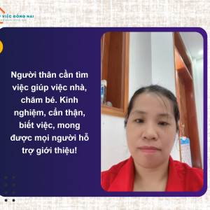 + Tính tình chị là người giản dị, chân chất, thái độ công việc tốt, hiền lành hiểu chuyện, việc nhà cửa nấu ăn dọn dẹp cô có thể phụ làm được.