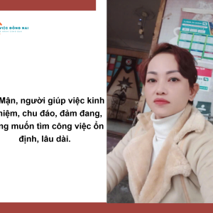 Chị Mận sinh năm 1985, quê Quảng Nam, là người phụ nữ chân thành, chịu khó và rất mong muốn tìm được một công việc giúp việc nhà ổn định, lâu dài. Chị không ngại việc khó, luôn sẵn sàng học hỏi để đáp ứng tốt nhất yêu cầu của gia chủ.