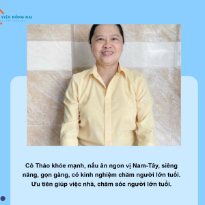 + có kinh nghiệm chăm bà lớn tuổi chỗ nên rất thương người già ,k ngại việc, cho bà ăn, tắm cho bà, mọi công việc liên quan bà đều biết, thức đêm chăm sóc tận tình.