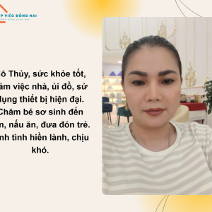 + Tính tình chị là người giản dị, chân chất, thái độ công việc tốt, hiền lành hiểu chuyện, việc nhà cửa nấu ăn dọn dẹp cô có thể phụ làm được