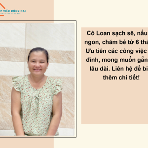 + Tính tình chị là người giản dị, chân chất, thái độ công việc tốt, hiền lành hiểu chuyện, việc nhà cửa nấu ăn dọn dẹp chị có thể phụ làm được.