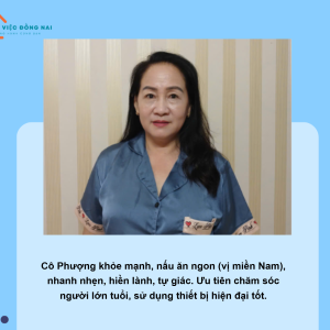 + Chị là người hiểu chuyện, hiểu tâm lý người lớn tuổi, biết cách quan tâm săn sóc cho các bác, Biết cách trò chuyện cho ông bà ăn, uống thuốc đúng giờ. Tối ngủ đêm với ông bà