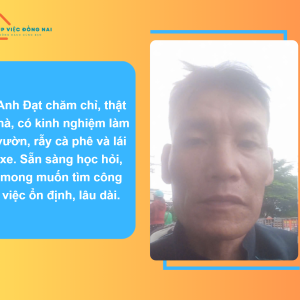 + Sức khỏe tốt,. Là người luôn chủ động, ham học hỏi biết lắng nghe tiếp thu ý kiến chủ nhà. + Tính tình anh hiền lành, nói chuyện dễ mến, là người chịu khó.