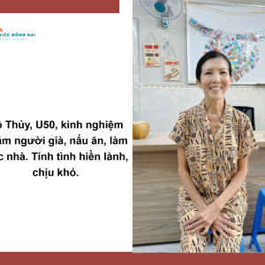 _Cô chuyên chăm ông bà bị tai biếm nằm một chỗ, bệnh, lẫn. Cho ông bà ăn, vệ sinh, tối dậy thay bỉm vệ sinh, dắt ông bà đi tiểu tiện. Cô biết cách dỗ dành ông bà, nói chuyện tâm sự với ông bà, lấy thuốc ông bà uống, vệ sinh phòng ông bà sạch sẽ. Biết cách giữ gìn và chăm nom ông bà, chăm sóc tận tình tận tâm