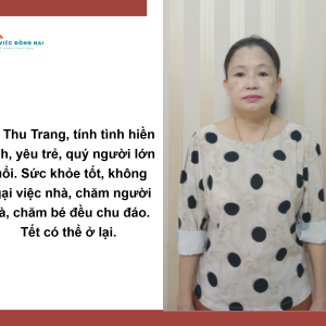 Cô Trang, 54 tuổi, quê Đồng Nai, là người phụ nữ hiền lành, dễ mến và có kinh nghiệm dày dặn trong việc chăm sóc gia đình. Cô mong muốn tìm được công việc ổn định, phù hợp với khả năng của mình.