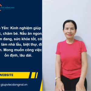 Cô Yến năm nay 54 tuổi, quê Đồng Nai, là người chân thành và không ngại khó. Cô mong muốn tìm được một công việc giúp việc nhà và chăm bé ổn định, lâu dài.