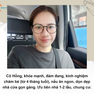 Cô Hồng có nhiều năm kinh nghiệm chăm sóc trẻ nhỏ, từng chăm bé cho người Hàn, người Pháp từ 4 tháng tuổi đến khi bé đi học. Cô có sức khỏe tốt, có thể làm việc ở nhà lầu hoặc chung cư. Cô sạch sẽ, gọn gàng, giỏi việc, chịu khó và biết cách sắp xếp công việc để gia đình sinh hoạt thoải mái.